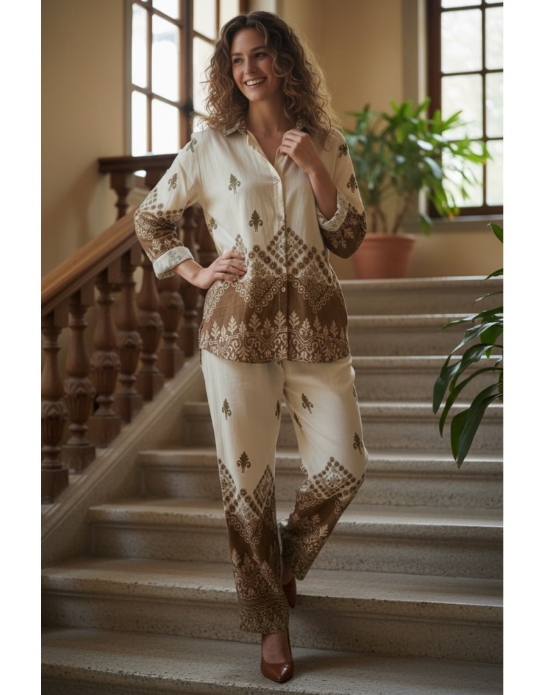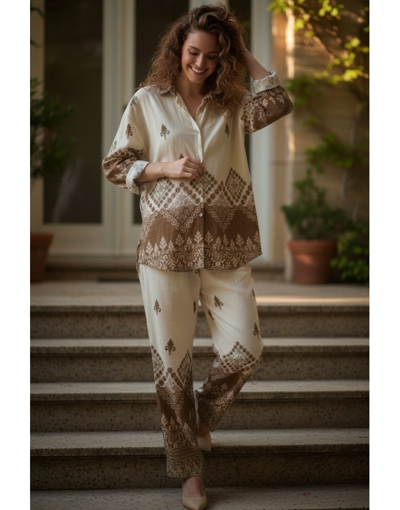 Комплект з штанами та рубашкою з пояском на гудзиках вільного кроя - ідеальний вибір для тих, хто цінує комфорт і стиль в спекотні літні дні. Це вільна і зручна модель, яка підійде як для повсякденного носіння, так і для відпочинку на пляжі або прогулянок по місту.Спинка рубашки довша,перед коротший.