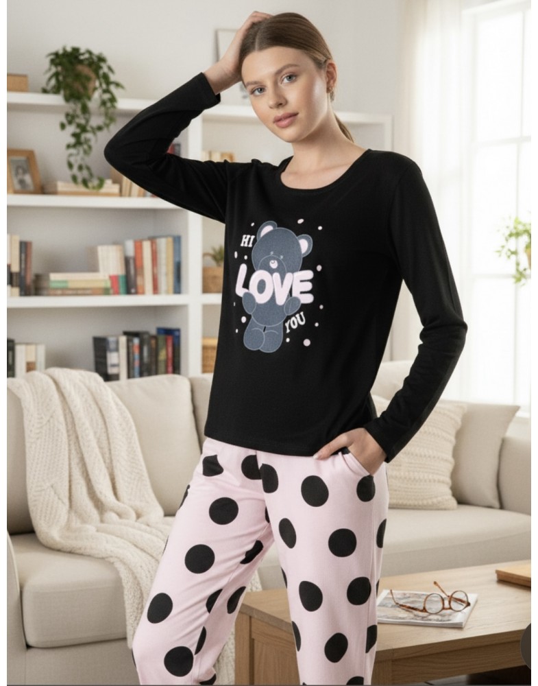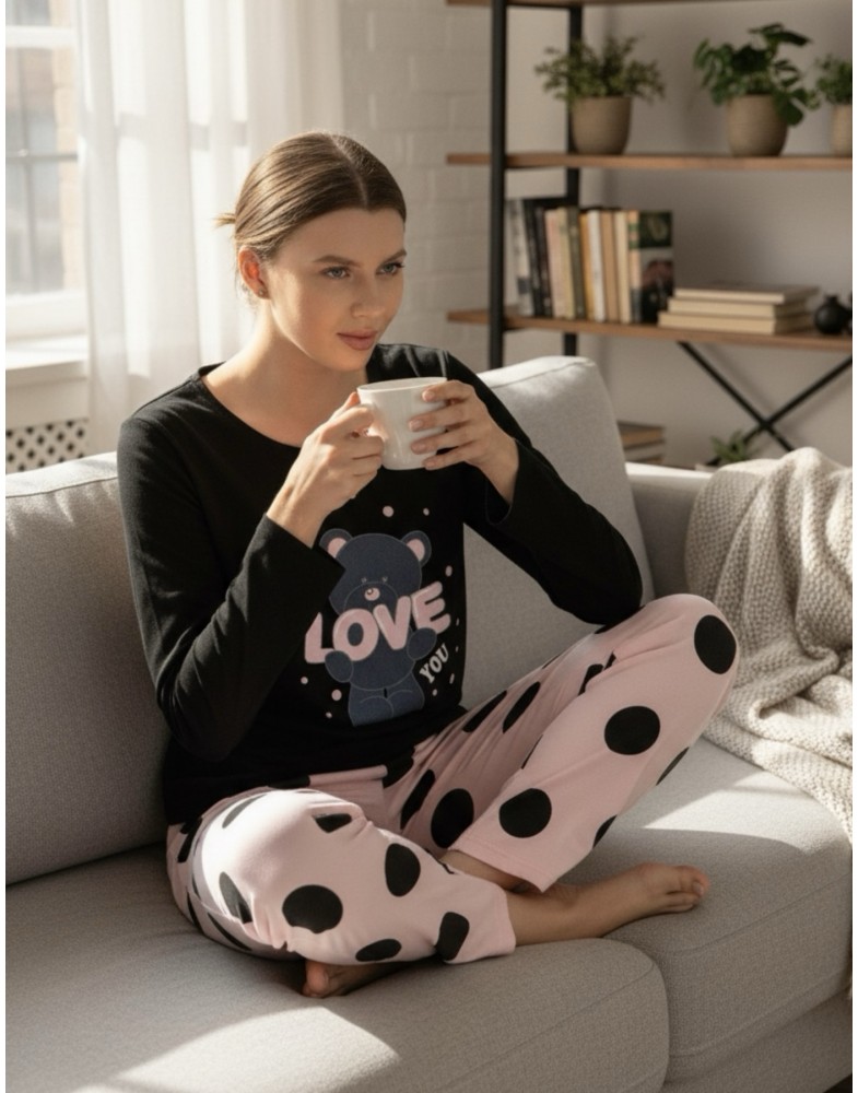 Молодіжна піжама з брюк і джемпера Rubina Secret 6233. Світлий джемпер з малюнком та різнокольорові брюки в прінти