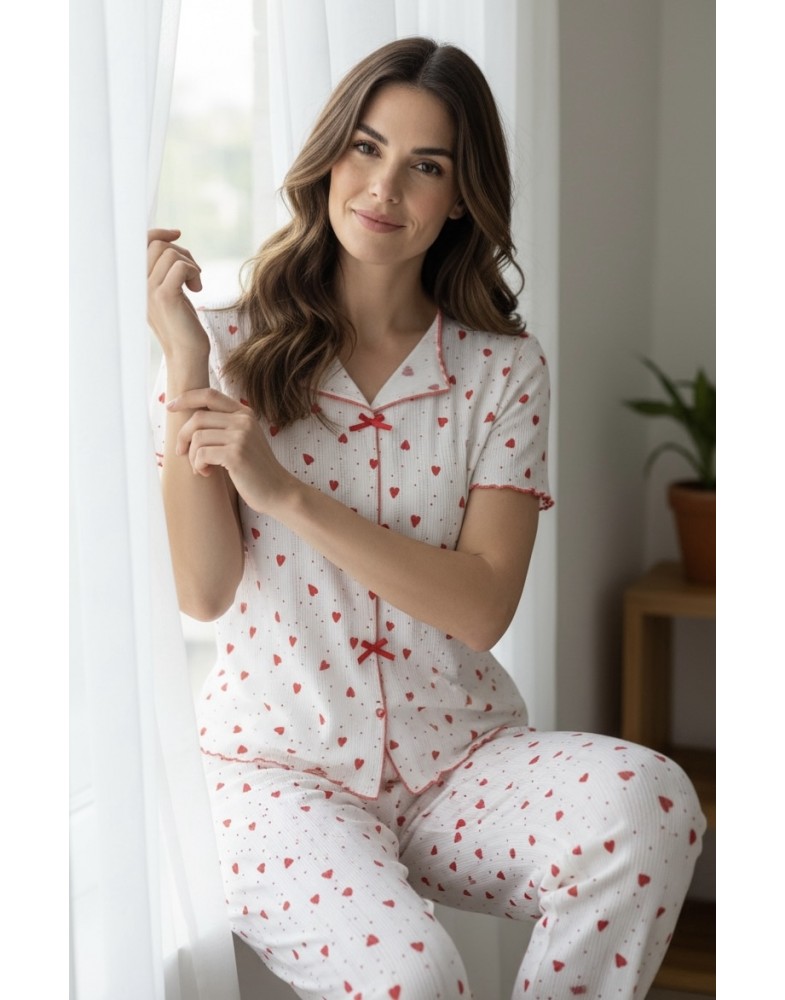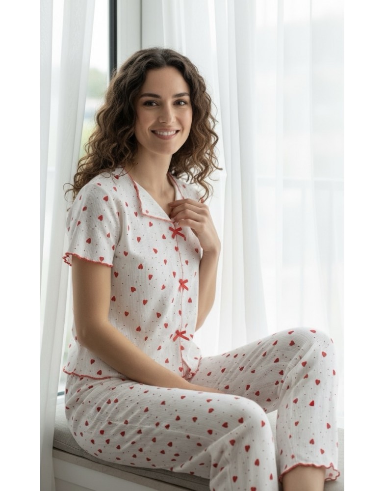 Жіноча піжама складаєть з рубашки на гудзиках і брюк на еластичній резинці. Виготовлена з бавовняної тканини з ажурною перфорацією, що надає їй легкість і комфорт під час носіння.