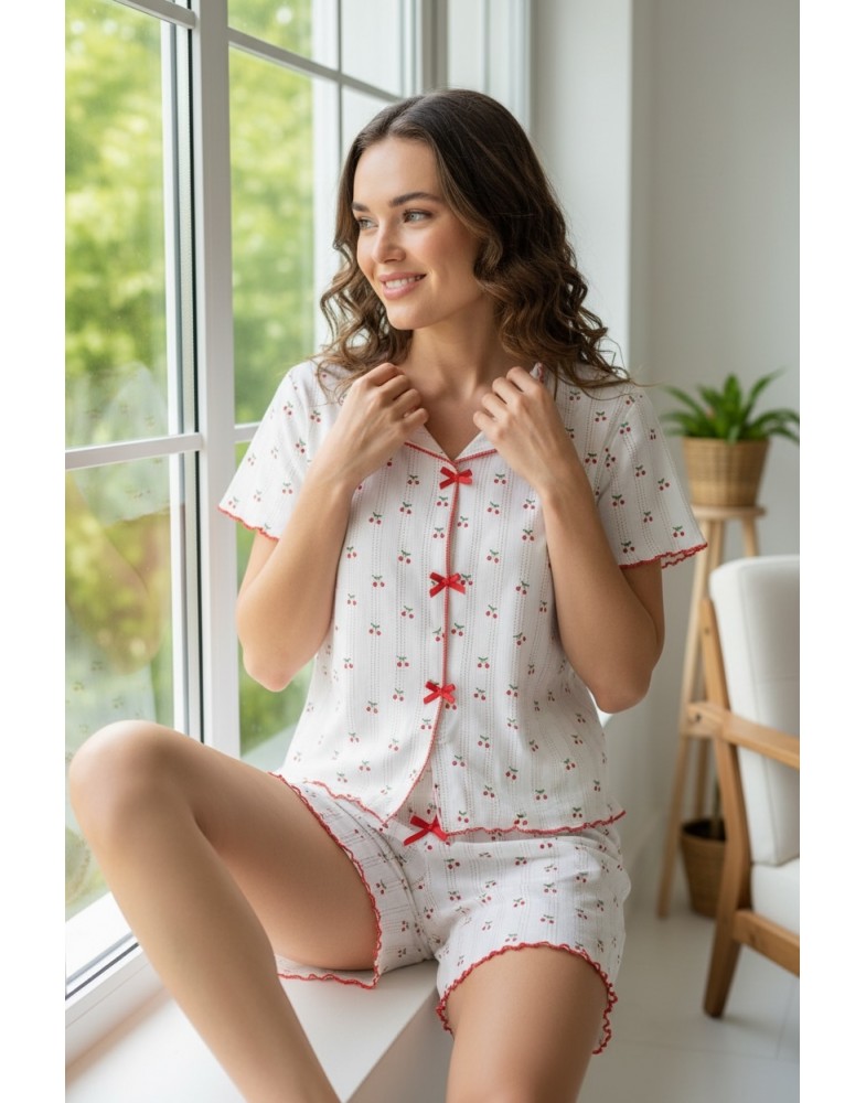 Жіноча піжама складається з футболки та шортів на еластичній резинці. Виготовлена з бавовняної тканини з ажурною перфорацією, що надає їй легкість і комфорт під час носіння.
