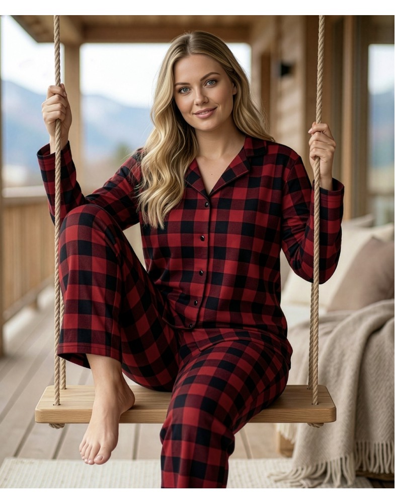 Женская пижама PIJAMONI состоит из рубашки на пуговицах и брюк на эластичной резинке